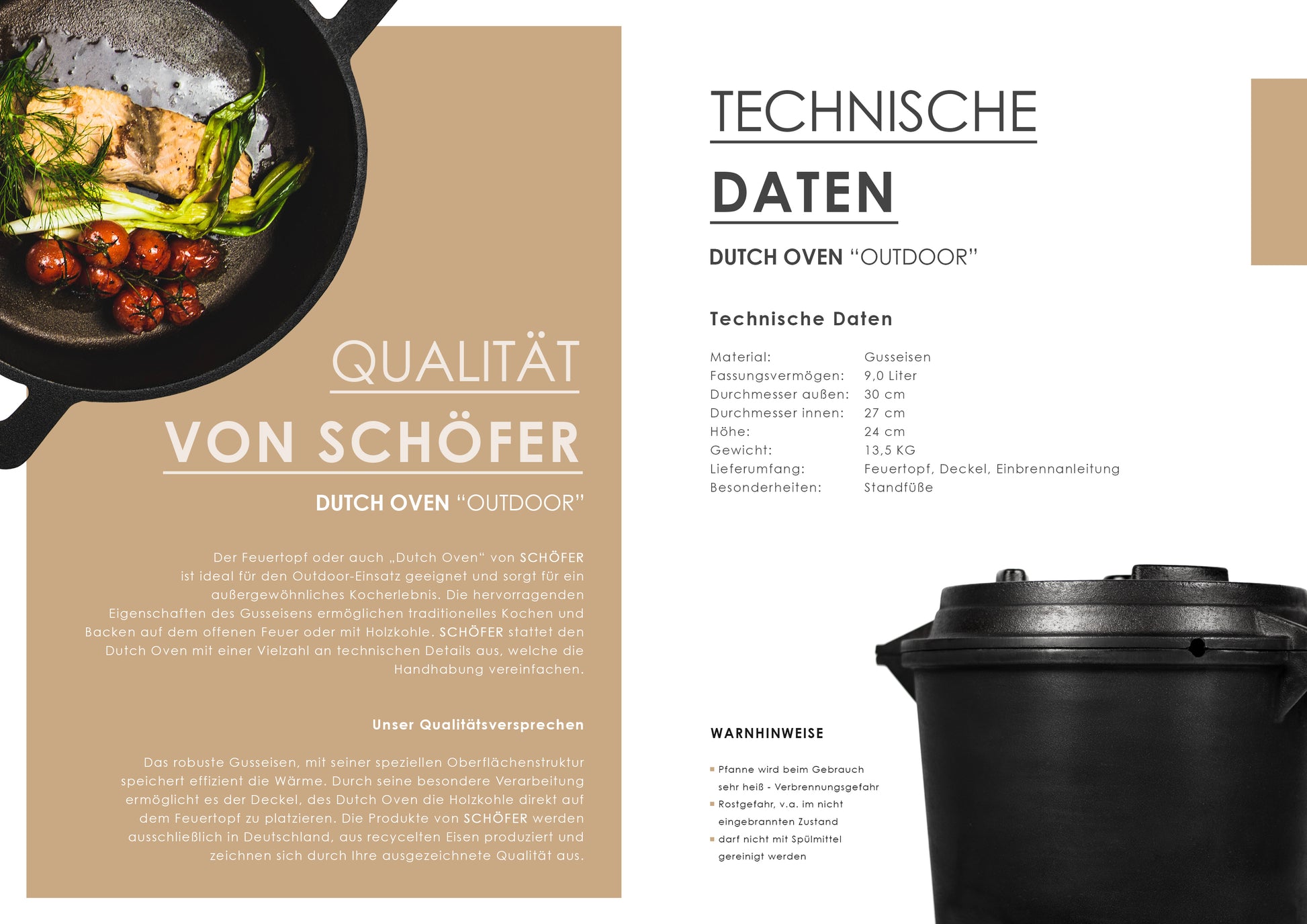 Der Feuertopf oder auch „Dutch Oven“ von SCHÖFER ist ideal für den Outdoor–Einsatz geeignet und sorgt für ein außergewöhnliches Kocherlebnis. Die hervorragenden Eigenschaften des Gusseisens ermöglichen traditionelles Kochen und Backen auf dem offenen Feuer oder mit Holzkohle. SCHÖFER stattet den Dutch Oven mit einer Vielzahl an technischen Details aus, welche die Handhabung vereinfachen.